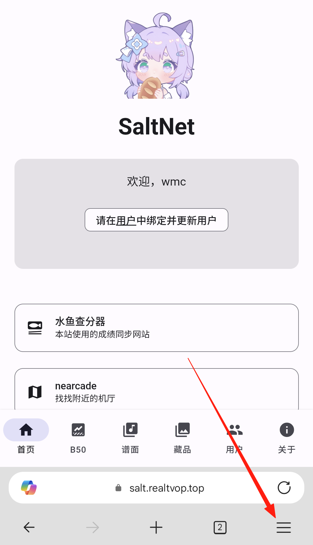 首先在浏览器中打开 SaltNet 页面,点击浏览器 更多 按钮(一般为三条横杠)。