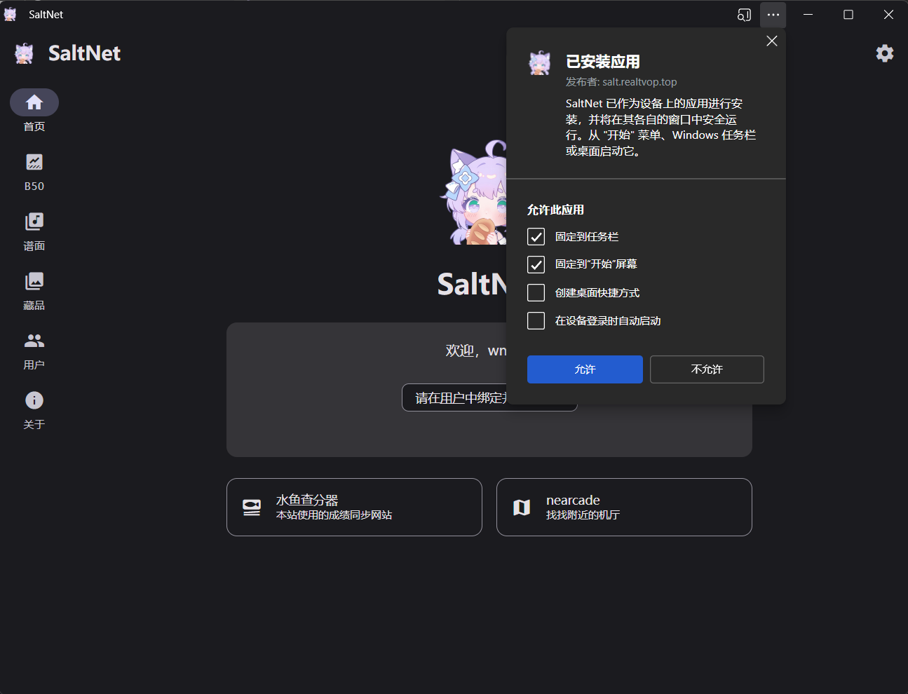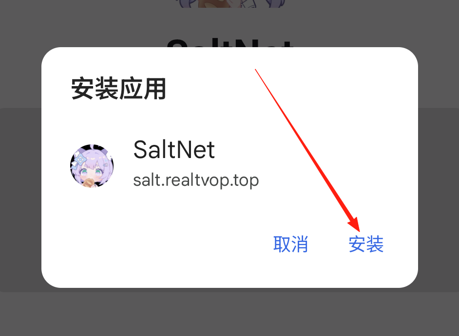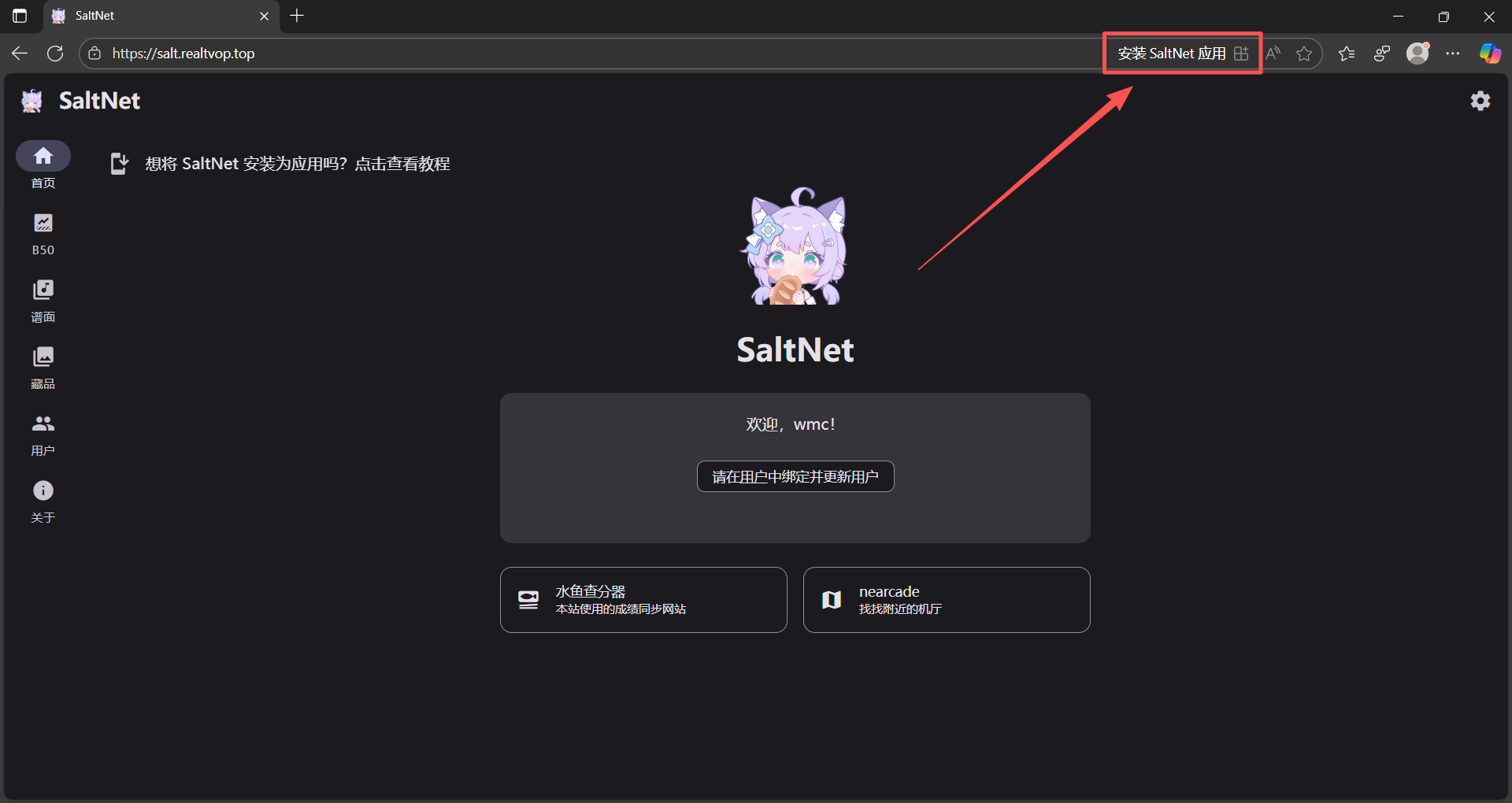 首先打开 SaltNet,此时浏览器会在地址栏弹出 PWA 应用安装提示。