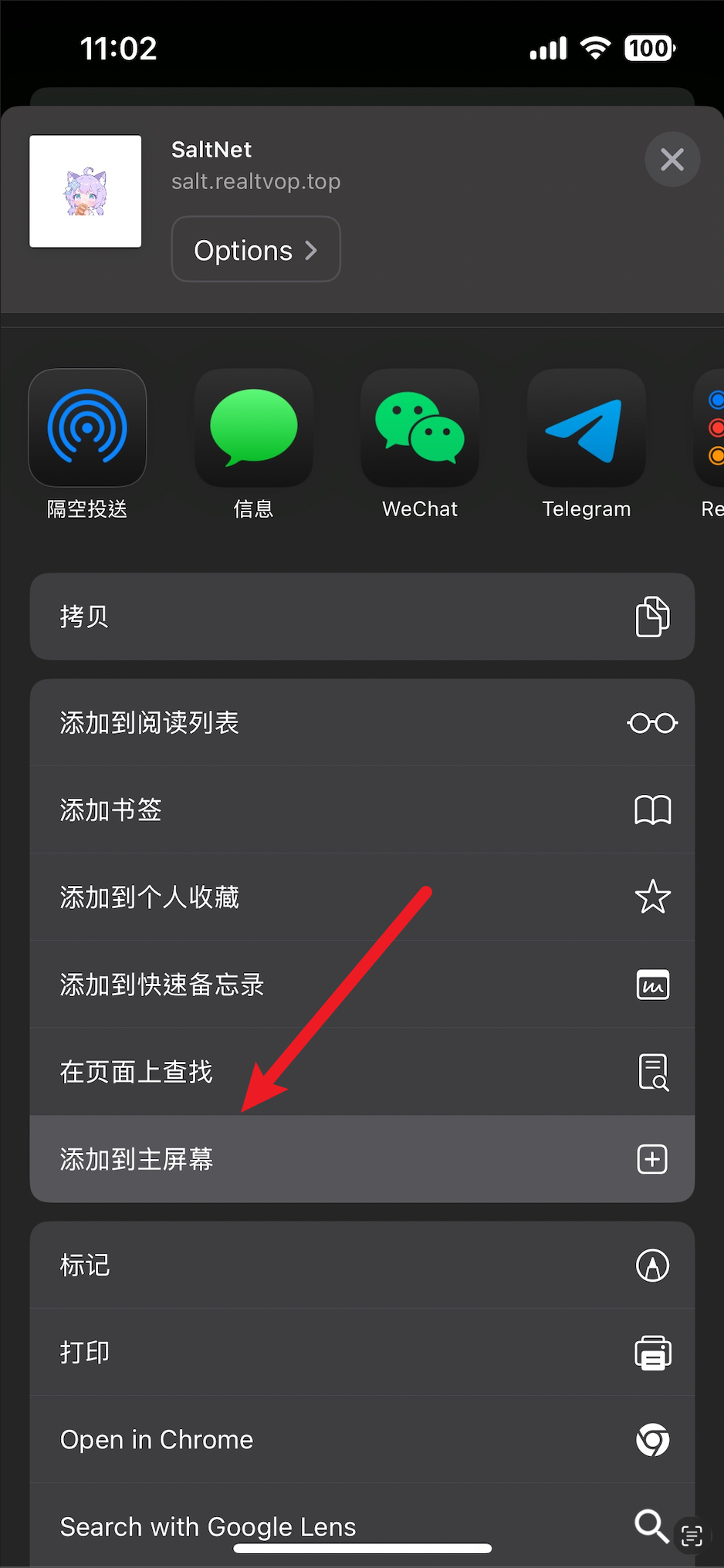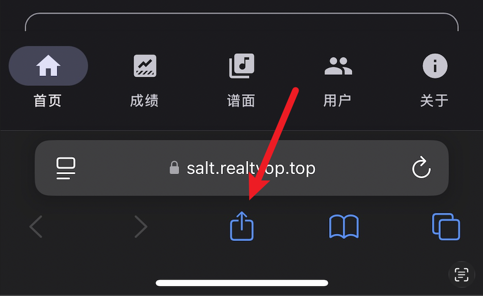 首先在 Safari 中打开 SaltNet,点击分享按钮。